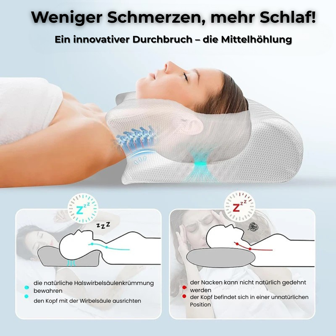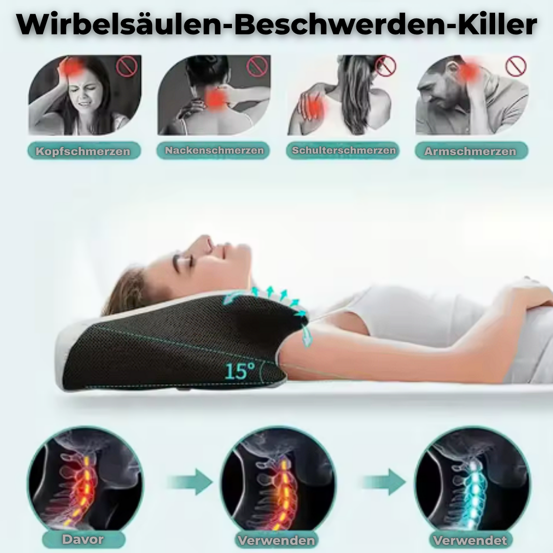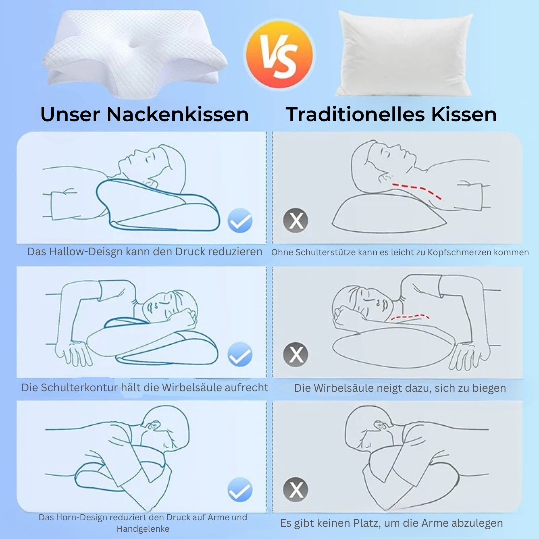 Laut einer Studie des Deutschen Ärzteblatts leiden über 60 % der Menschen regelmäßig unter Nackenverspannungen – häufig ausgelöst durch falsche Schlafhaltung und ungeeignete Kissen. Die meisten herkömmlichen Kissen sind viel zu weich, zu hoch oder einfach schlecht geformt – und zwingen deinen Nacken in unnatürliche Positionen. Die Folge: Druck auf Wirbel, Muskeln und Nerven – Nacht für Nacht.