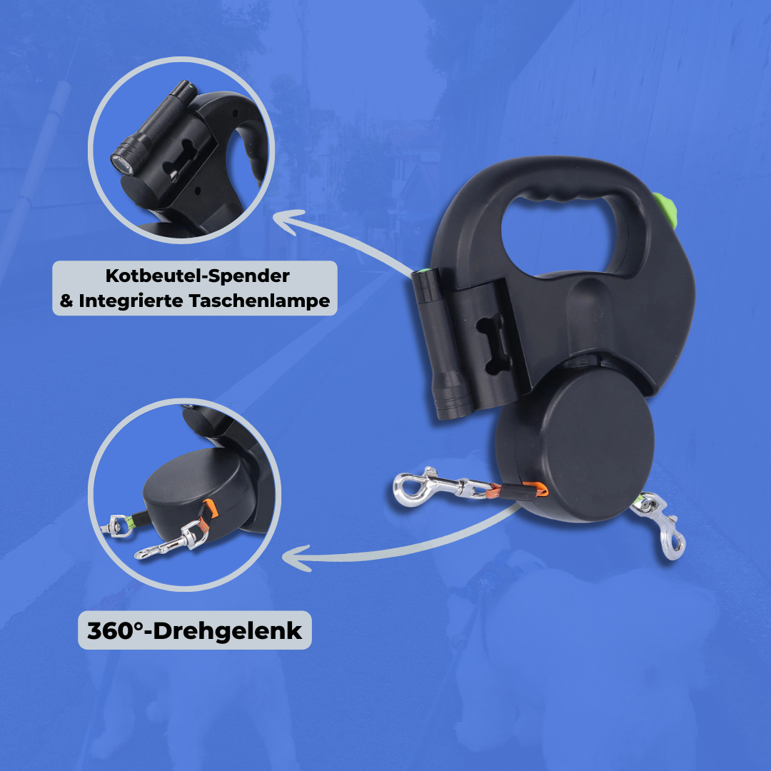 Ja, die Doppelleine verfügt über einen integrierten Kotbeutel-Spender, sodass die Beutel immer griffbereit sind – für ein entspanntes, stressfreies Gassi gehen.
