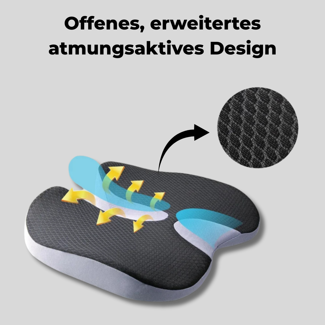 Das ergonomische Design des Sitzkissens entlastet Rücken, Hüfte und Steißbein und fördert die natürliche Ausrichtung der Wirbelsäule. So werden Fehlhaltungen und Verspannungen vermieden.