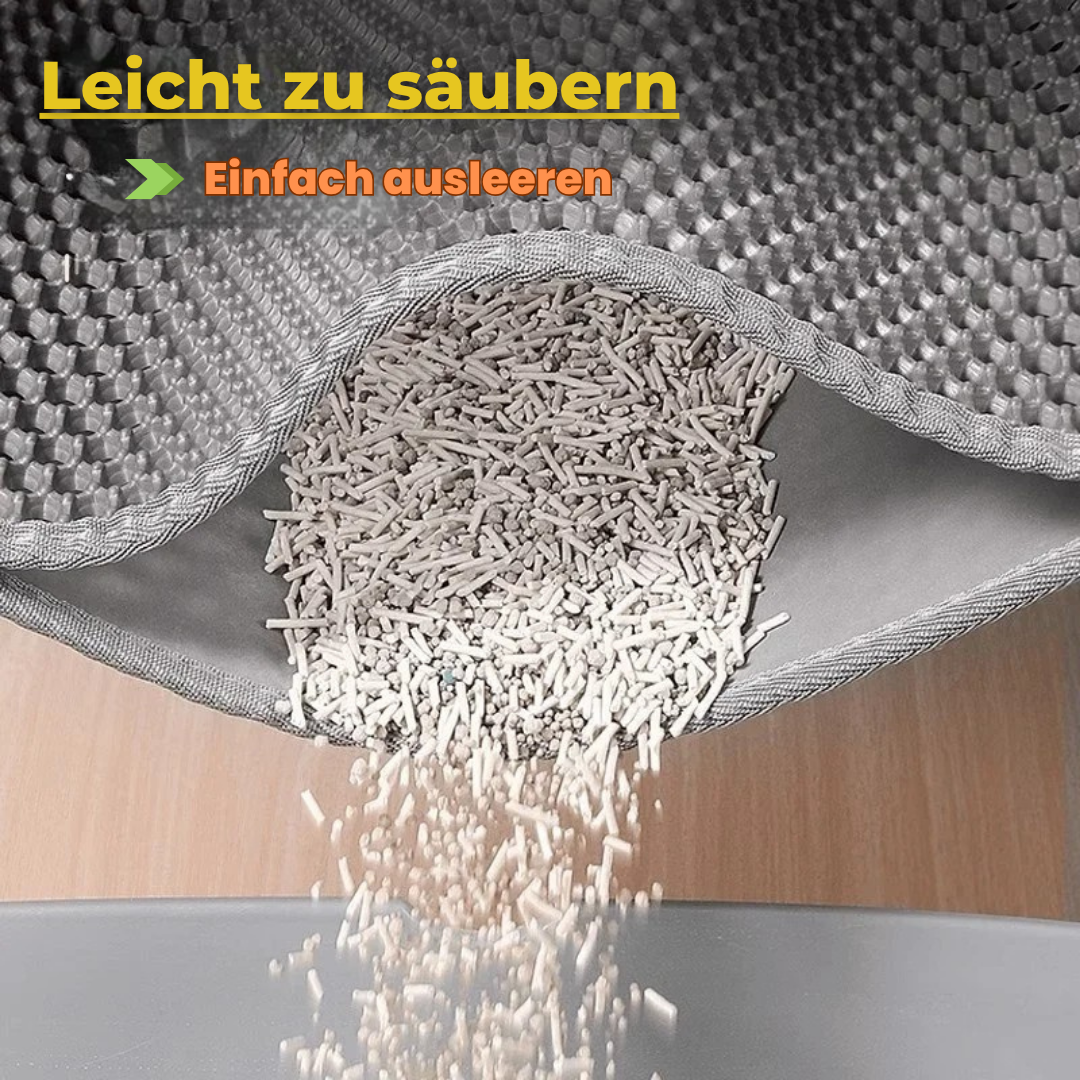 Ganz einfach: Du öffnest die Seite der Wabenkonstruktion und kannst das aufgefangene Streu direkt ausleeren. Außerdem ist das Material wasserabweisend und pflegeleicht, sodass du es bei Bedarf einfach ausklopfen oder abspülen kannst.